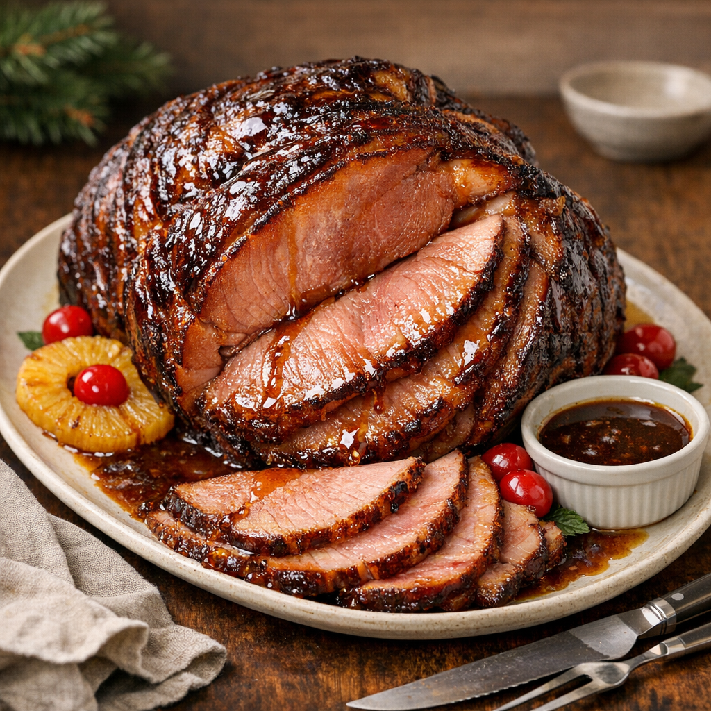 A classic American holiday-style baked ham finished with a glossy brown sugar glaze of mustard, pineapple, and warm spices. Simple technique, big results: gently heat the ham, then glaze and caramelize for a burnished, sweet-savory crust.