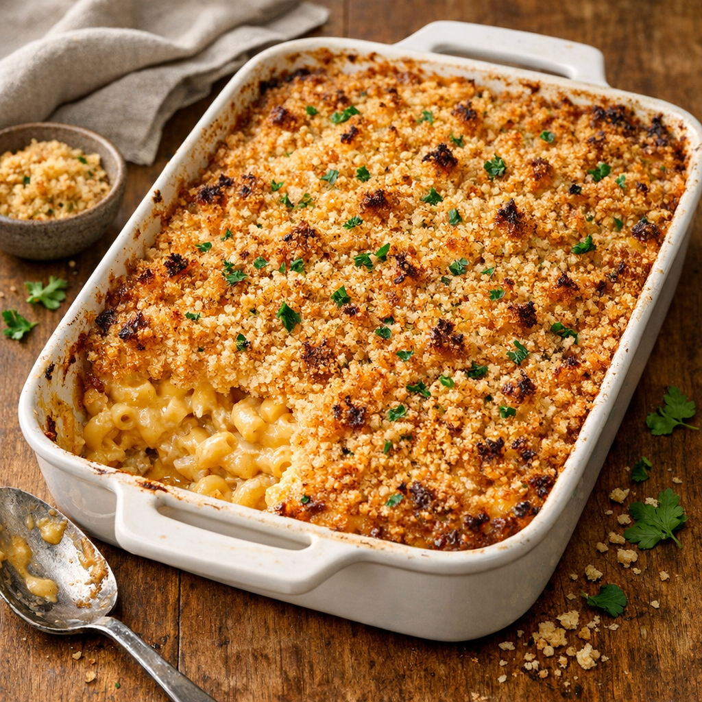 A classic American baked mac and cheese with a silky cheddar sauce and a buttery, crunchy breadcrumb topping. This version uses a simple roux-based cheese sauce for reliable results and a quick oven bake to set the casserole without drying it out.