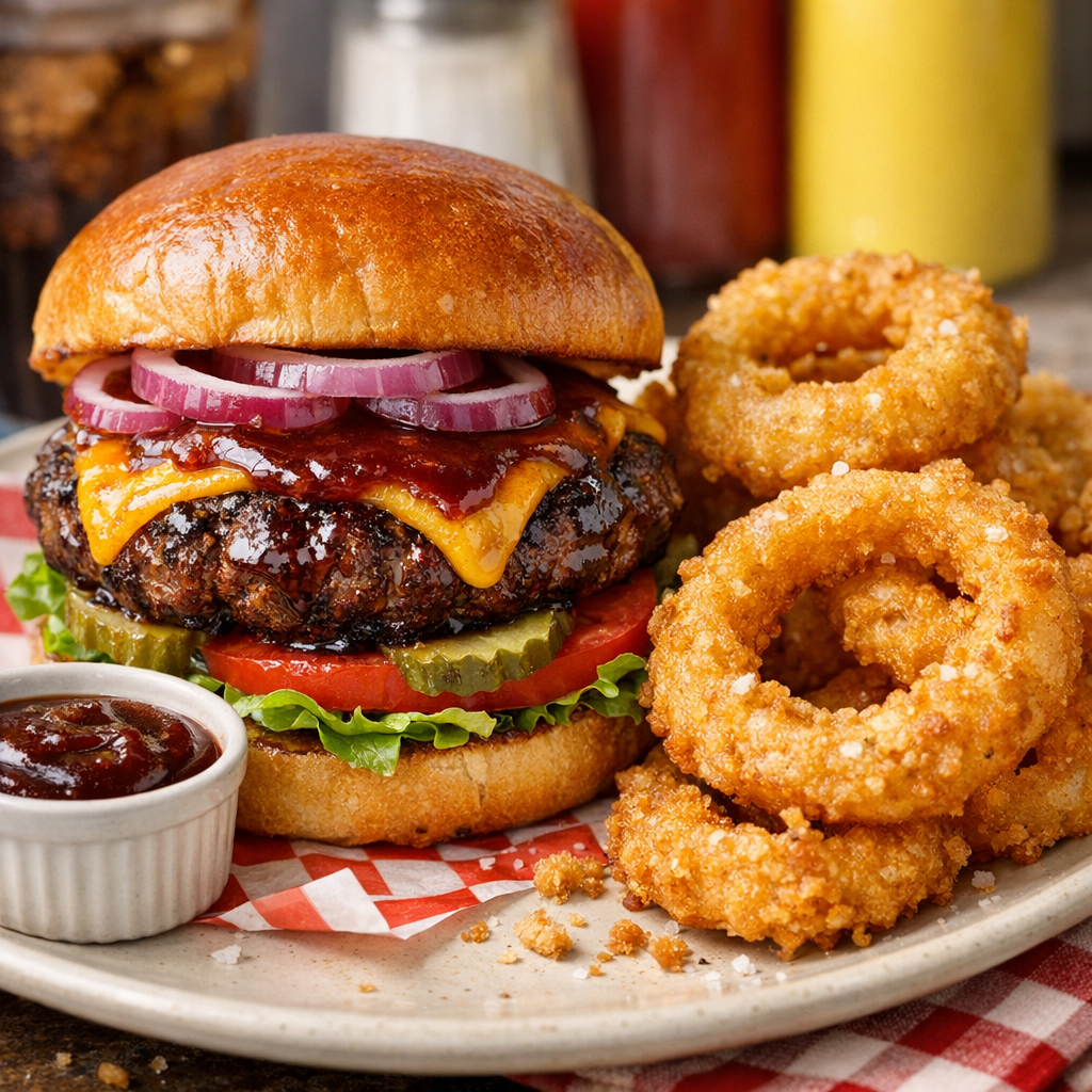 Classic American cookouts aren’t about complicated food—they’re about nailing the fundamentals. Here, we build a well-seasoned beef patty, sear it hard for flavor, then finish with a sticky BBQ glaze without burning the sugar. The onion rings are the crunchy counterpoint: cold batter, hot oil, and a quick drain for maximum crispness.