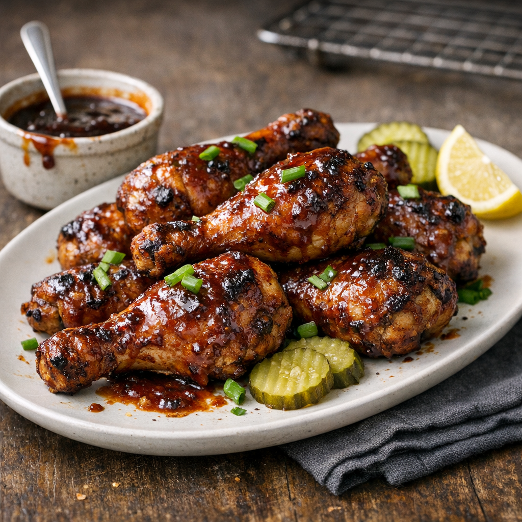 Classic American BBQ drumsticks baked (or grilled) until juicy, then lacquered with a sweet-smoky sticky sauce that clings to every bite. A simple dry brine and a quick reduction step are the keys to deep flavor and that backyard-barbecue gloss.