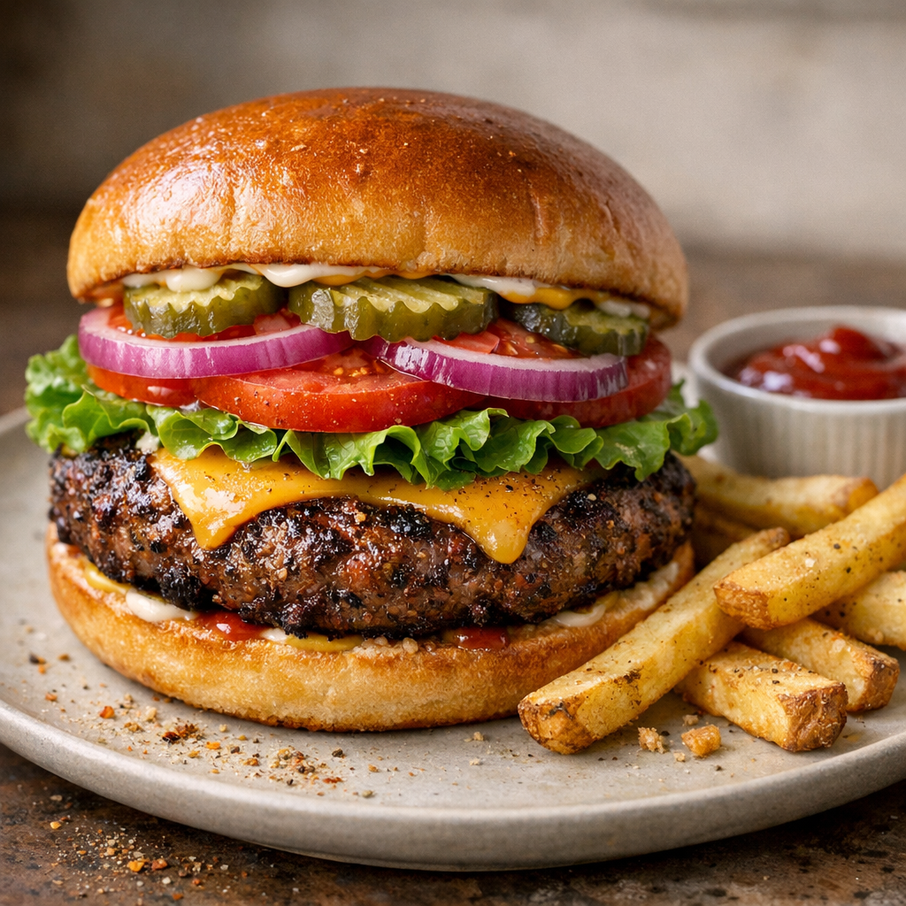 Rest and serve: Rest patties 2 minutes, then serve on toasted buns with classic toppings.