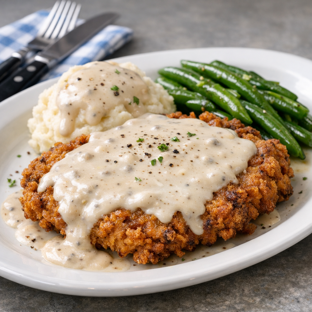 A true American diner classic: tenderized beef steaks dredged in seasoned flour, fried until crisp and golden, then smothered in a creamy black-pepper gravy made from the pan drippings. This recipe focuses on the “why” behind each step—so you get crunchy coating, juicy meat, and gravy that’s smooth, not pasty.