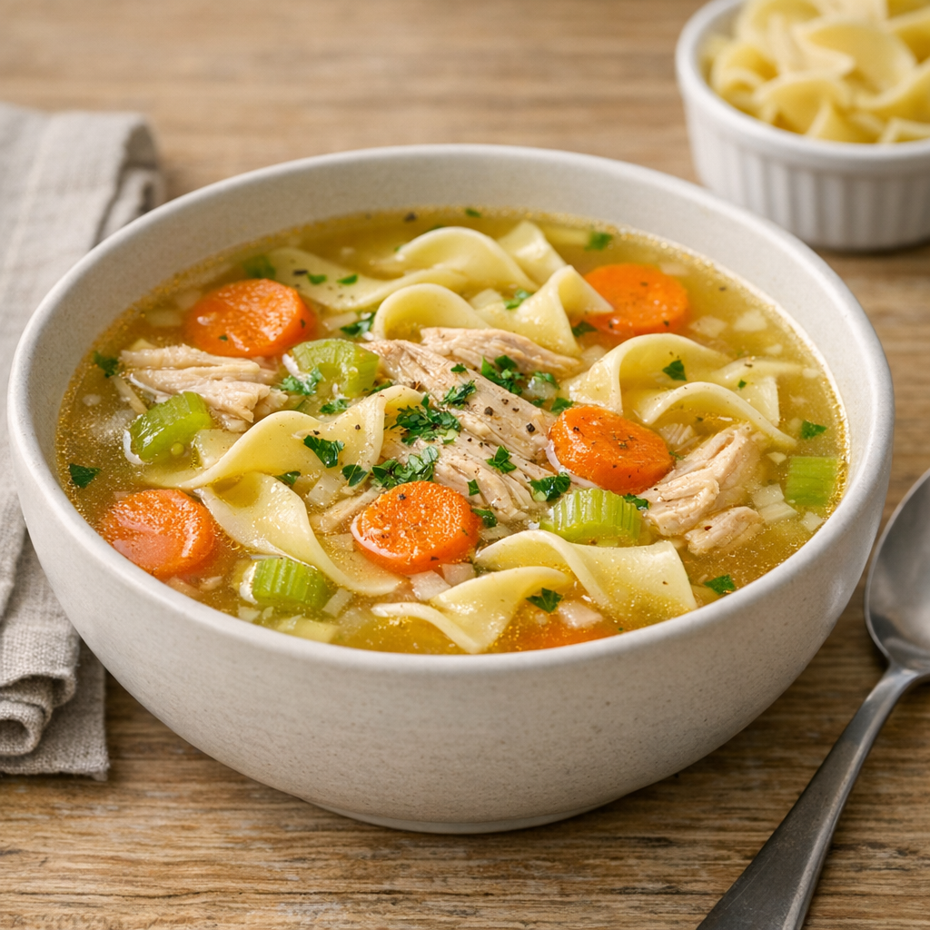 A classic American chicken noodle soup with a clear, savory broth, tender chicken, and slurp-worthy egg noodles—built the traditional way with aromatic vegetables and a gentle simmer.