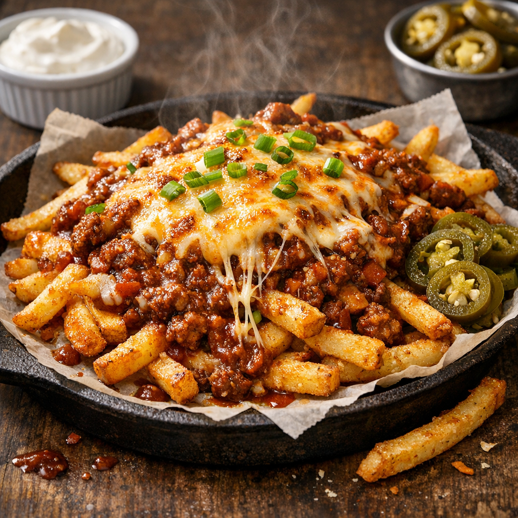 Crispy oven fries piled high with classic beef chili and melted cheddar-jack—an American sports-bar staple you can make at home with reliable, game-day timing.