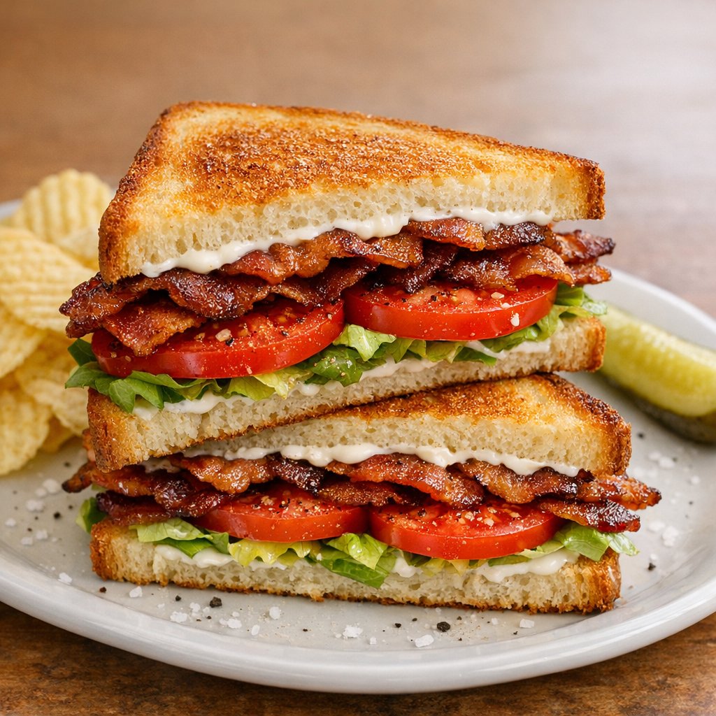 A true American diner classic: crisp bacon, juicy tomatoes, crunchy lettuce, and a generous swipe of mayo on evenly toasted bread. This version focuses on the small details—tomato seasoning, bacon texture, and toast technique—for a BLT that tastes simple yet dialed-in.