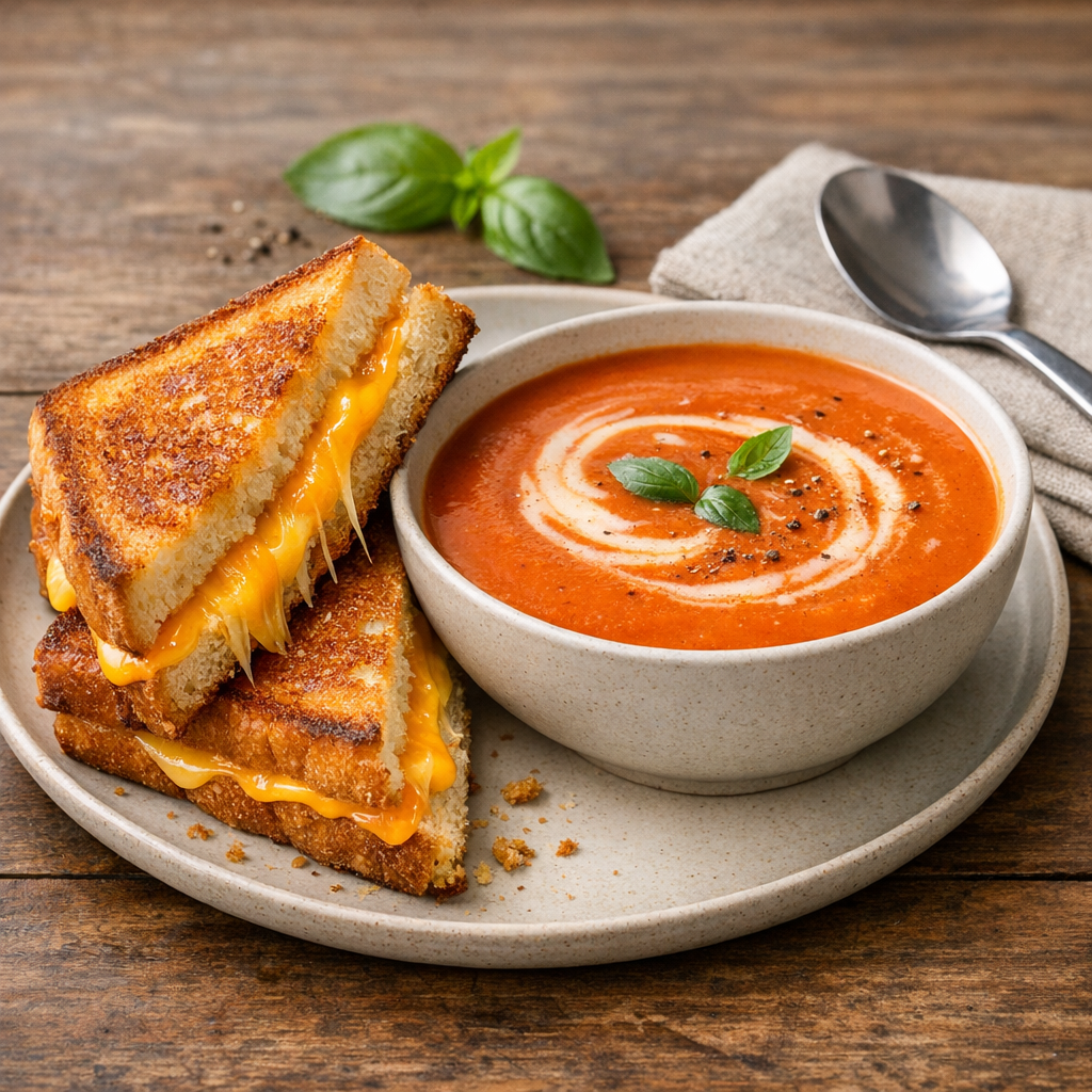 A timeless American comfort-food pairing: crisp, buttery grilled cheese with a smooth, tangy tomato soup. This version teaches the why behind each step—gentle heat for even browning, a touch of dairy for a velvety soup, and smart seasoning to balance acidity.