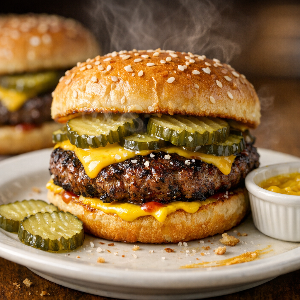 A true American diner-style hamburger: juicy beef patties seared hot, tucked into toasted buns, and finished with yellow mustard and crisp dill pickles. This recipe focuses on simple technique—proper seasoning, a hot pan or grill, and minimal handling—for a classic, reliable result.