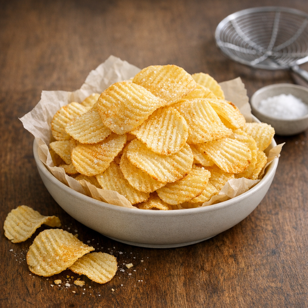 Extra-crunchy, classic American potato chips made the traditional way: thin-sliced potatoes, a careful rinse-and-soak to remove surface starch, and a steady fry in hot oil for a shatteringly crisp bite. Finish with fine salt while they’re hot, or season like a diner-style snack bar.