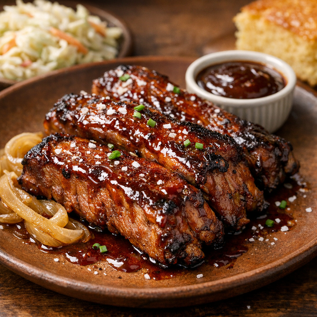 Tender, oven-braised country-style pork ribs finished under high heat with a glossy, sticky BBQ glaze. This classic American approach uses low-and-slow cooking for fork-tender meat, then a quick caramelized finish for that backyard-barbecue flavor—no smoker required.