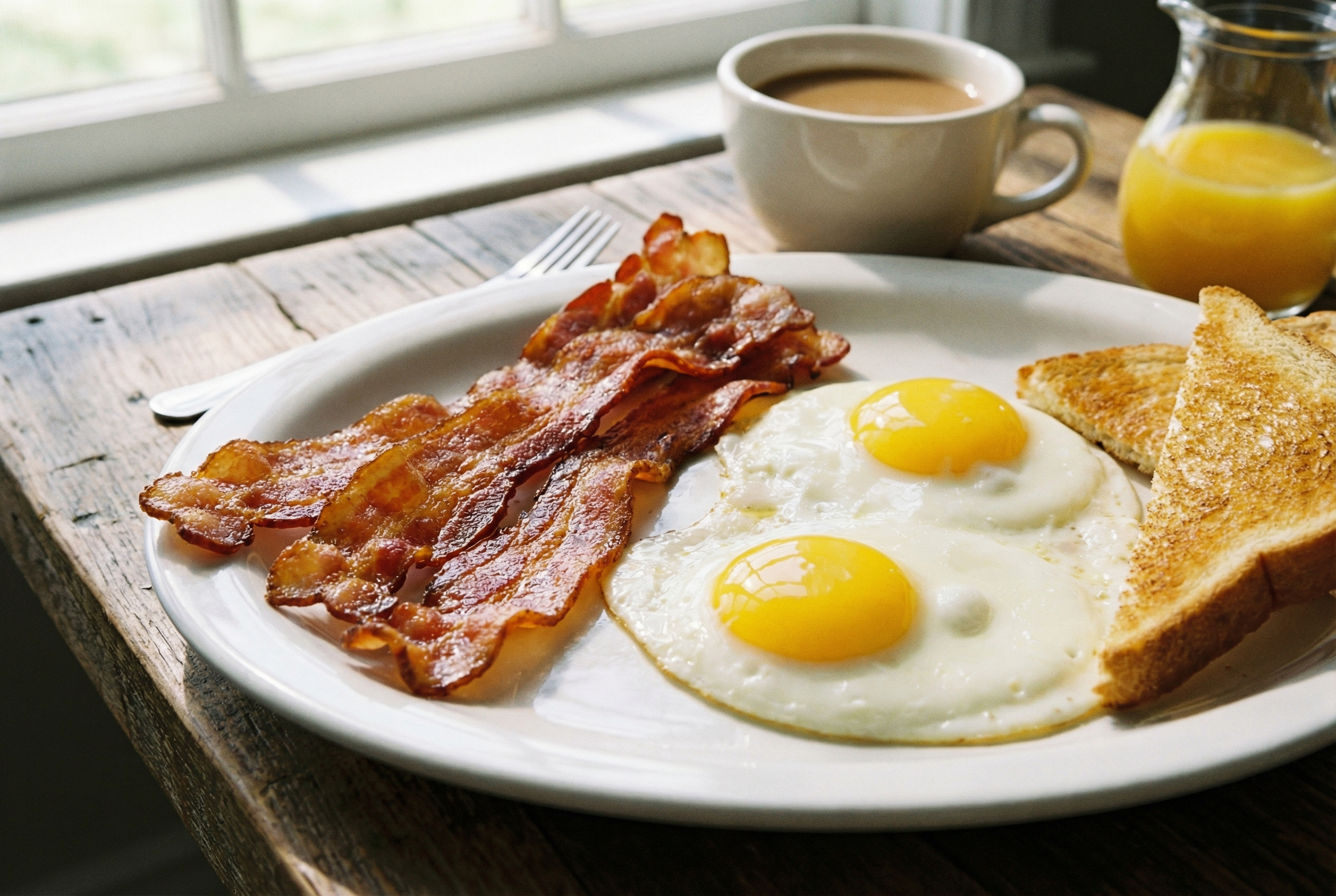 A classic American breakfast plate: shatteringly crisp bacon and fried eggs with set whites and your choice of runny or jammy yolks. This method teaches heat control, fat management, and timing so both components land on the plate hot and exactly how you like them.