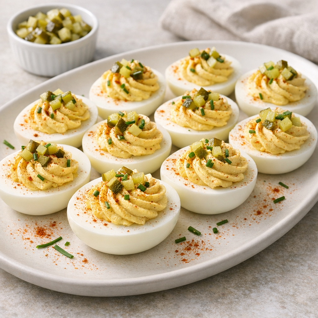 Classic deviled eggs made brighter and bolder with dill pickle juice, a touch of Dijon, and a whisper of smoked paprika. Familiar, crowd-pleasing, and just tangy enough to make people ask what your secret is.