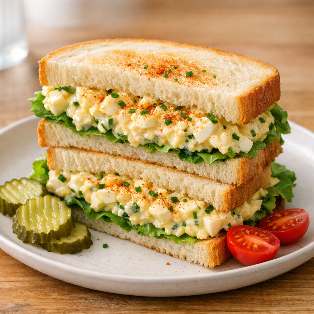 A classic American egg salad sandwich made the traditional way—creamy, bright, and well-seasoned—finished with sweet paprika and fresh chives for a clean, savory lift. Ideal for lunchboxes, picnics, and diner-style comfort at home.