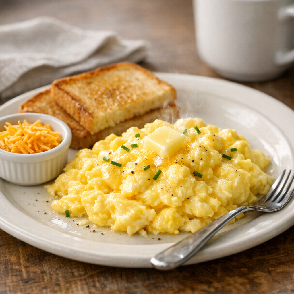 Soft, creamy, and cloud-like scrambled eggs made with a classic American diner approach: low heat, plenty of butter, and gentle stirring. This method teaches control—of temperature, timing, and texture—for consistently tender curds.