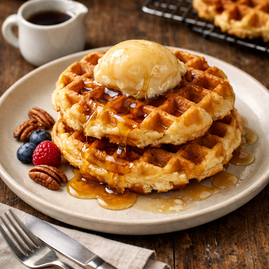 Waffles are one of America’s most beloved breakfast classics, prized for their contrast of crunchy ridges and tender interiors. The key is a properly heated waffle iron and a batter that isn’t overmixed, which keeps the texture light. Maple butter is a small upgrade with big payoff: it delivers maple flavor evenly without flooding the waffle. Once you master this base, you can confidently build a whole waffle repertoire from it.