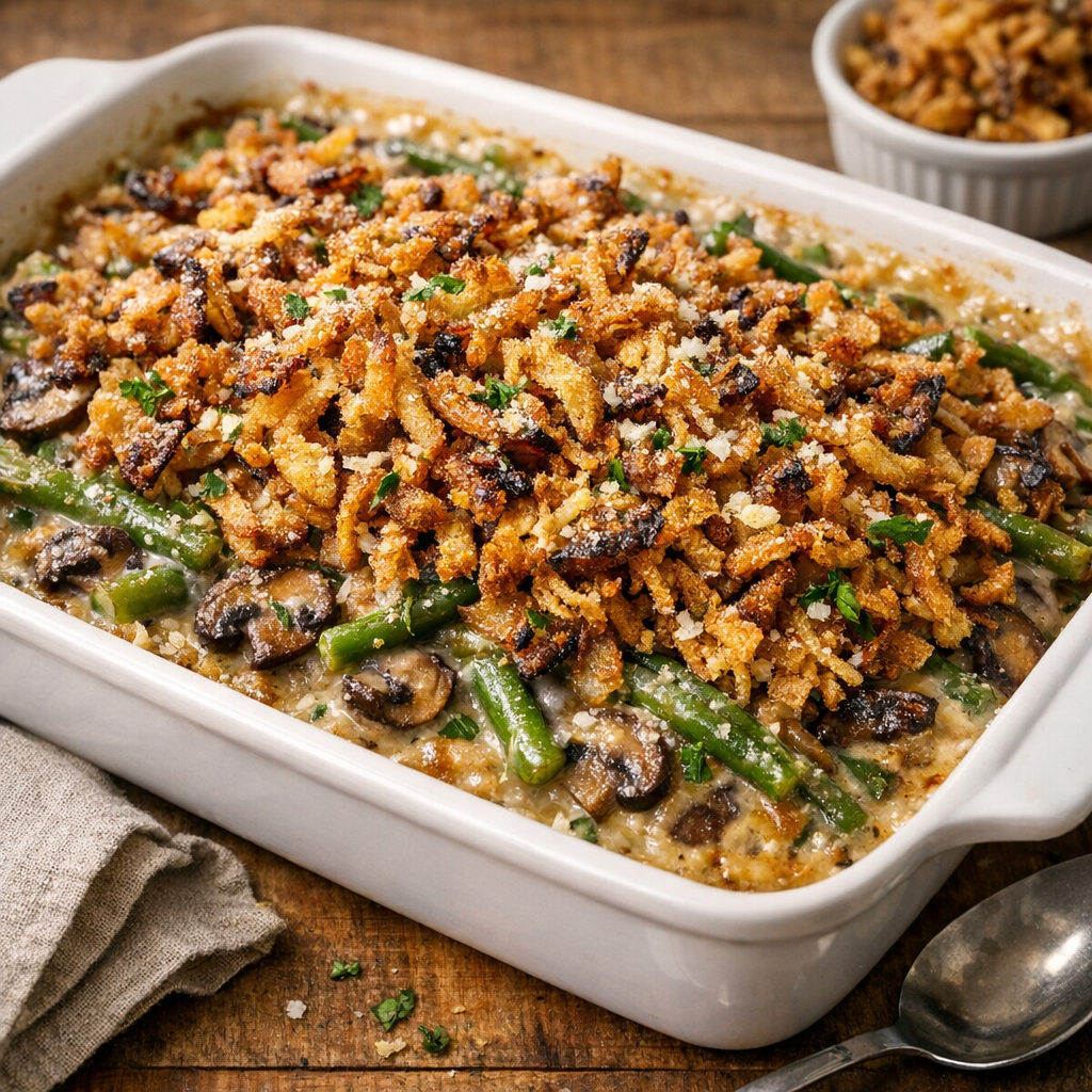 Green bean casserole became a holiday staple because it’s simple, savory, and reliably crowd-pleasing. Making it from scratch is a great lesson in classic American technique: a roux-thickened sauce, properly seasoned vegetables, and a crunchy topping for contrast. Once you taste the depth from real mushrooms and onions, you’ll understand why this version earns its place on the table.