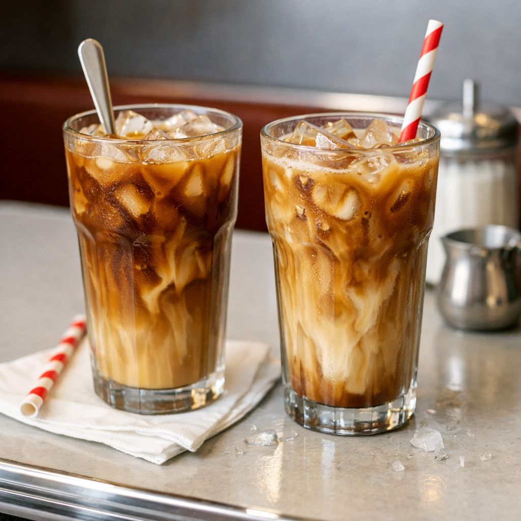 A classic American diner iced coffee: bold, smooth, and properly chilled so it stays strong instead of watery. This method uses a quick coffee concentrate and a simple cream finish for that familiar counter-service taste at home.
