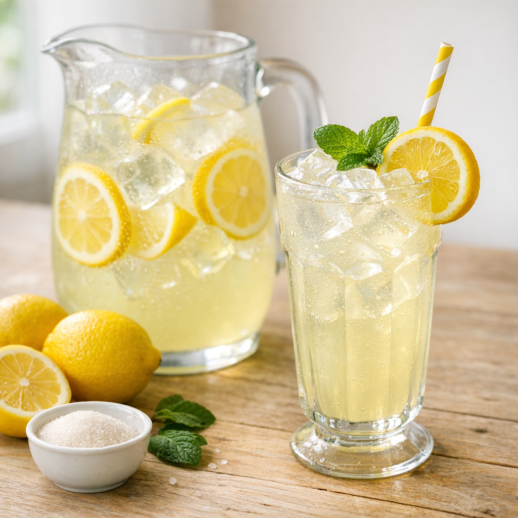Bright, sweet-tart classic American lemonade with a “fair stand” flavor: bold lemon, clean sweetness, and plenty of ice. This method uses a quick lemon-sugar syrup for smoother, more consistent results than stirring sugar into cold water.