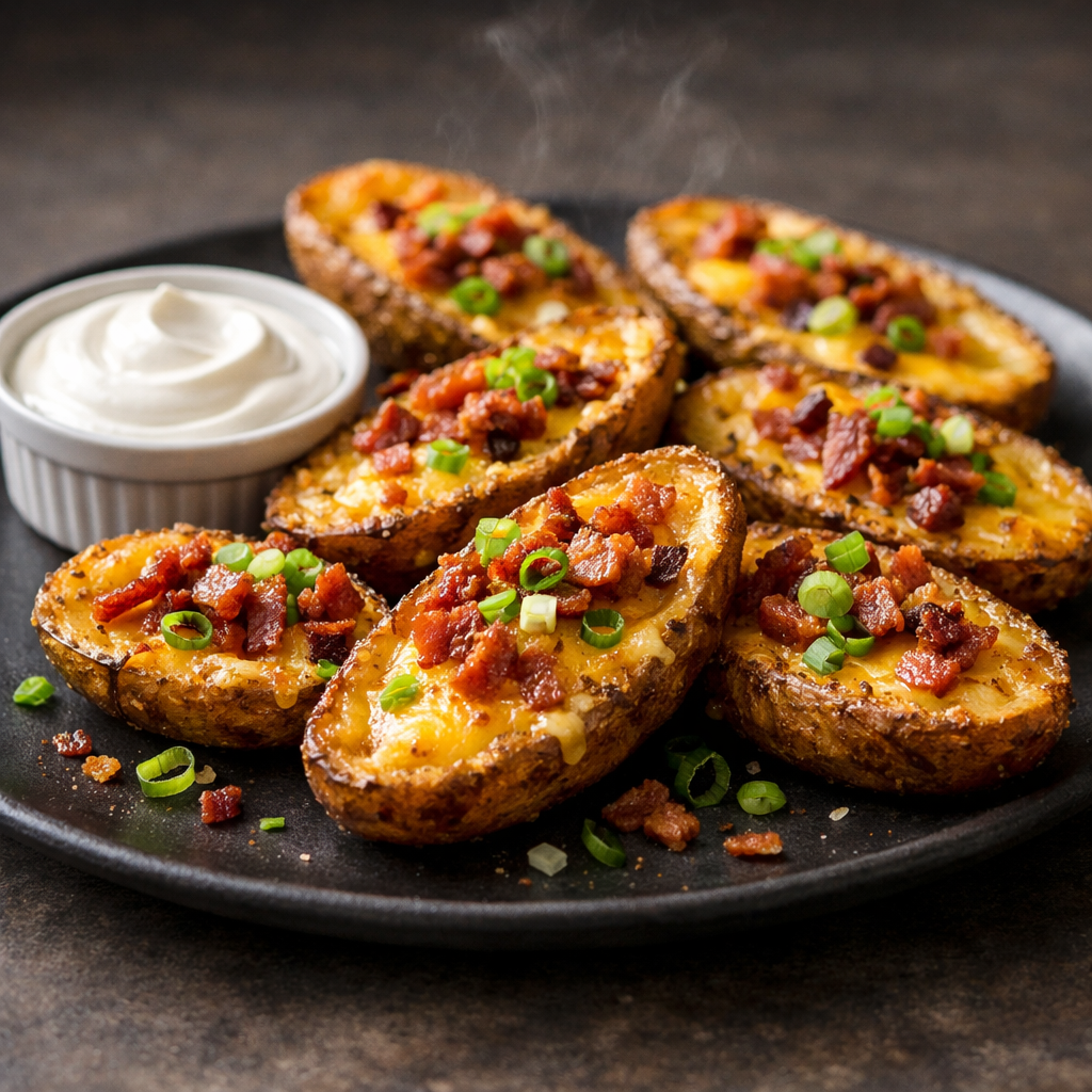 Crisp baked potato skins piled with melty cheddar, smoky bacon, and fresh scallions—an American sports-bar classic you can make at home with dependable results.