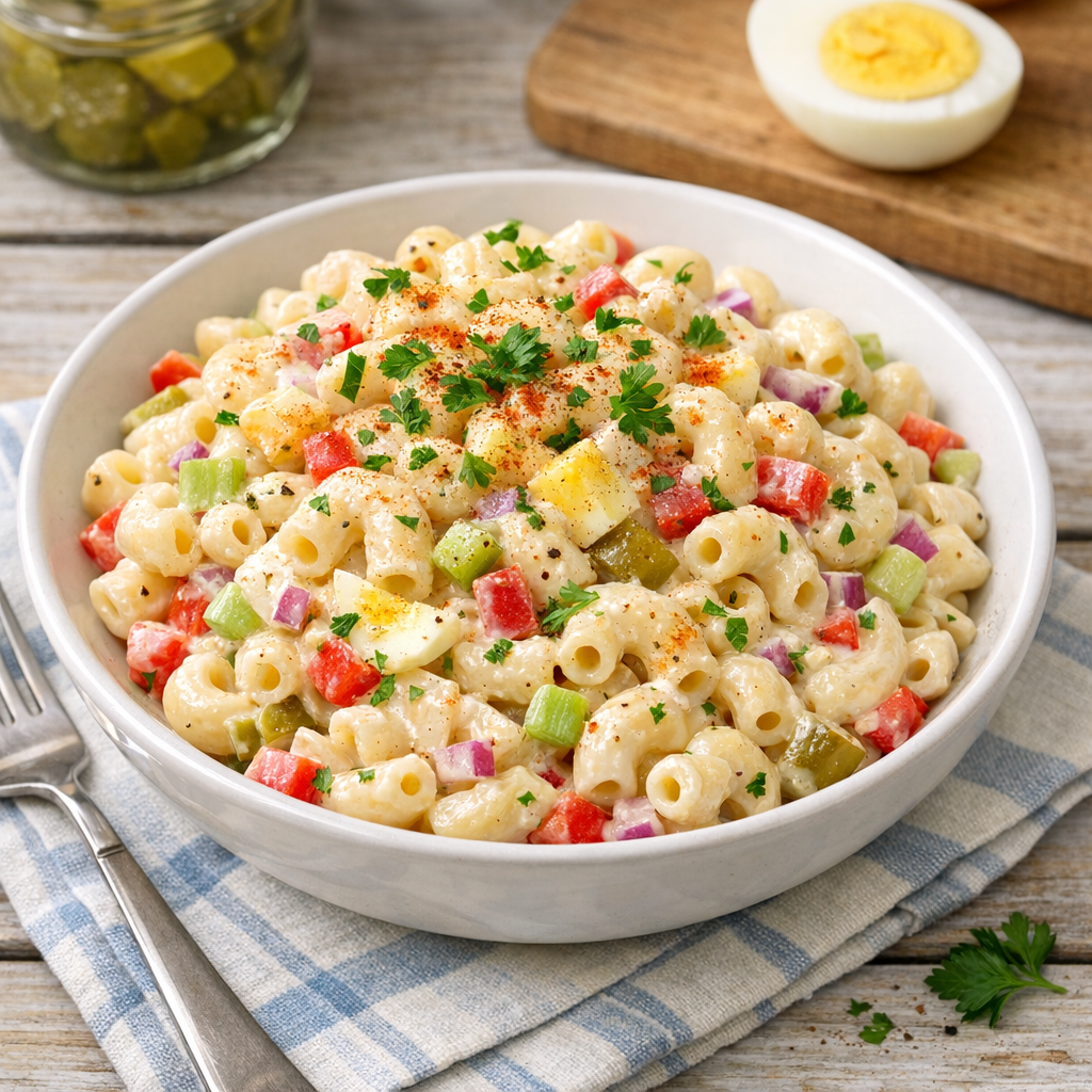 A classic American macaroni salad with tender pasta, crisp vegetables, and a creamy, tangy dressing that holds up beautifully on the picnic table. This version balances sweetness, acidity, and crunch—exactly what you want alongside burgers, hot dogs, and barbecue.