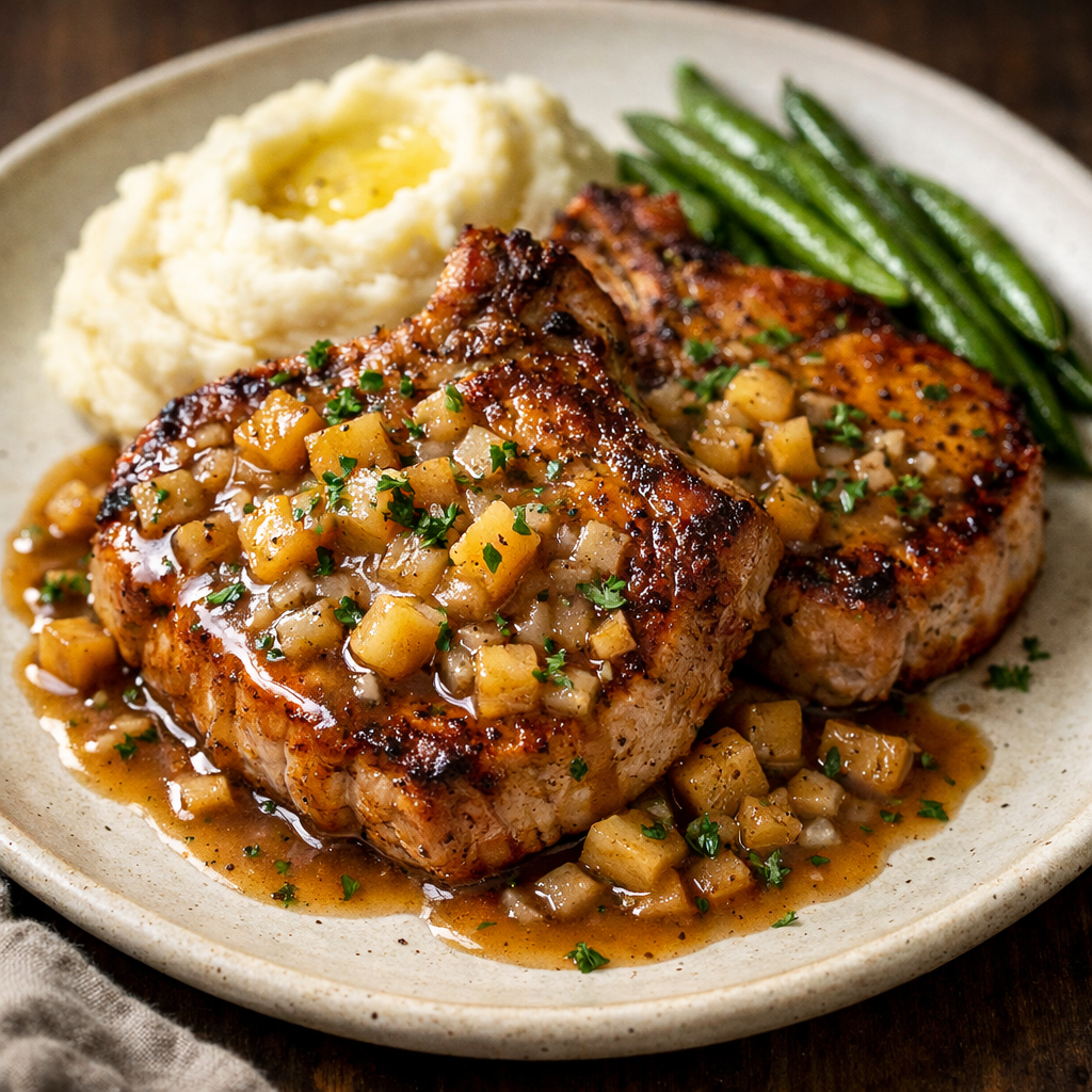 Juicy, pan-seared pork chops finished with a classic apple gravy built from browned bits, sautéed aromatics, and a splash of cider. This is an American comfort-food staple that balances savory pork with gentle sweetness—perfect for weeknights but special enough for Sunday supper.