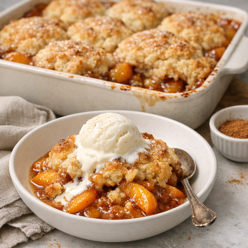 A classic American peach cobbler with juicy, cinnamon-kissed fruit and a tender, buttery biscuit topping that bakes up golden and crisp at the edges. Designed for reliable results with fresh, frozen, or canned peaches.