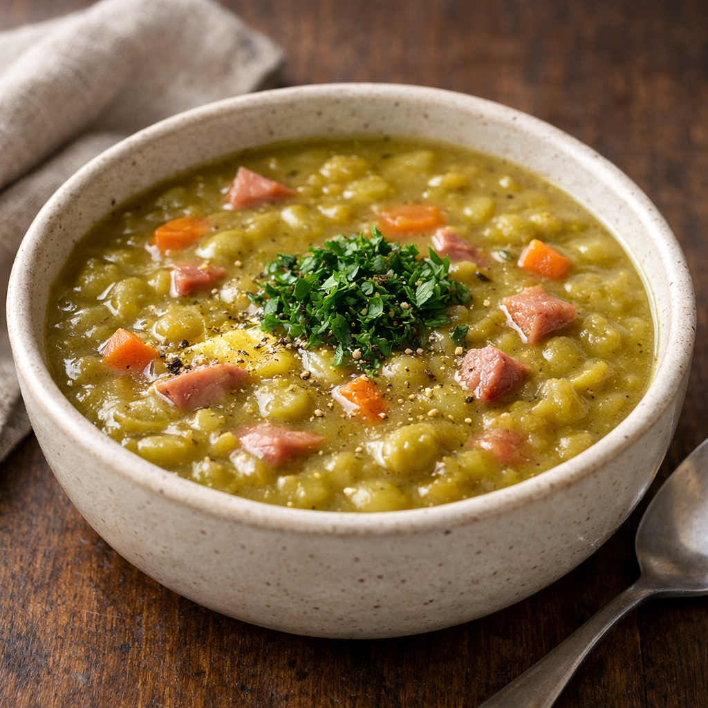 A classic American split pea soup built on smoked ham, aromatic vegetables, and slow-simmered split peas for a thick, comforting bowl. This version explains the key steps—rinsing peas, building a proper mirepoix base, and simmering to the right texture—so you can reliably get that old-fashioned, spoon-coating consistency.