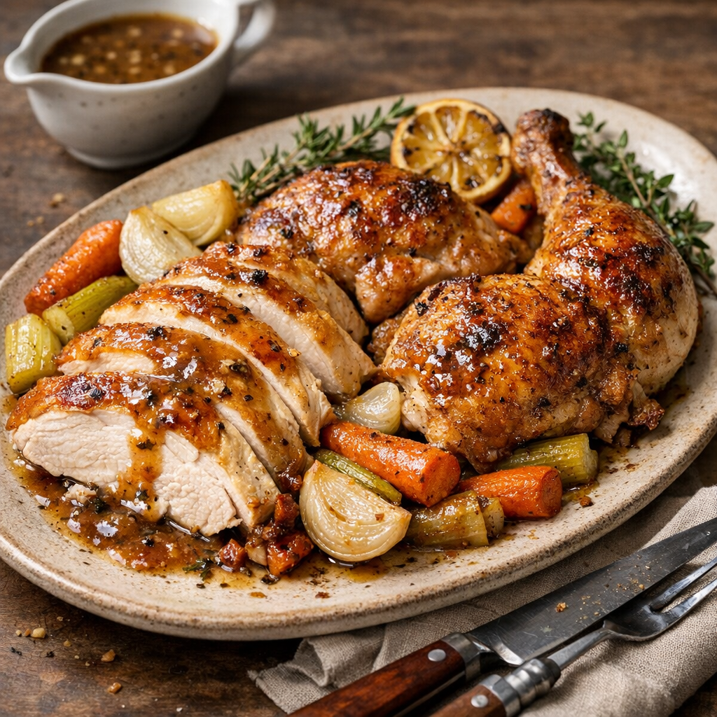 Strain the sauce for a smooth result (optional) or serve rustic with the softened vegetables. Carve the chicken and spoon pan drippings over the meat at the table.