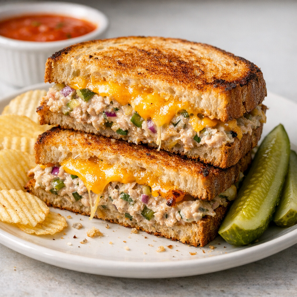 A classic American diner-style tuna melt: creamy tuna salad brightened with dill pickles, piled onto toasted bread, and finished with sharp cheddar melted until bubbly and golden.
