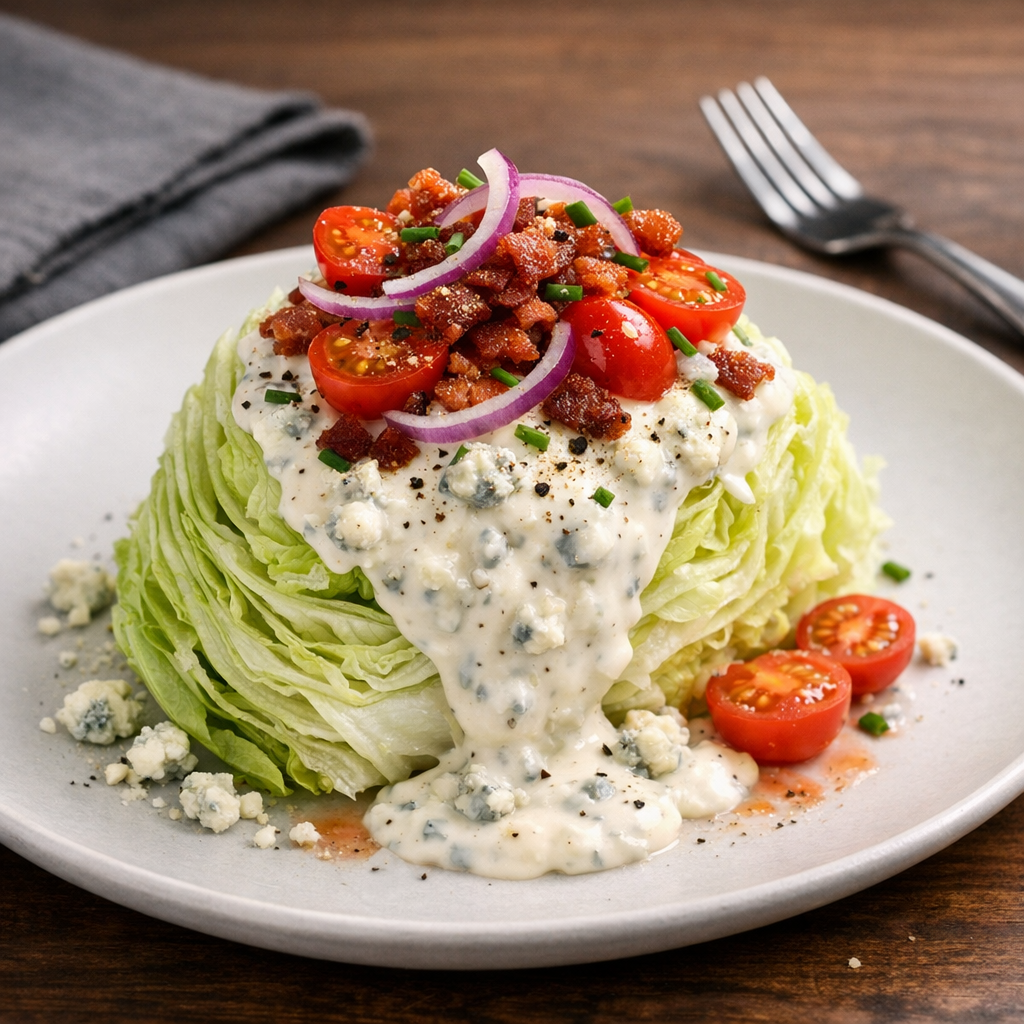 A steakhouse-style American classic: crisp iceberg lettuce wedges topped with smoky bacon, ripe tomatoes, and a bold, creamy blue cheese dressing. This version explains the “why” behind each step so you get maximum crunch, balanced salt, and a dressing that clings to every bite.