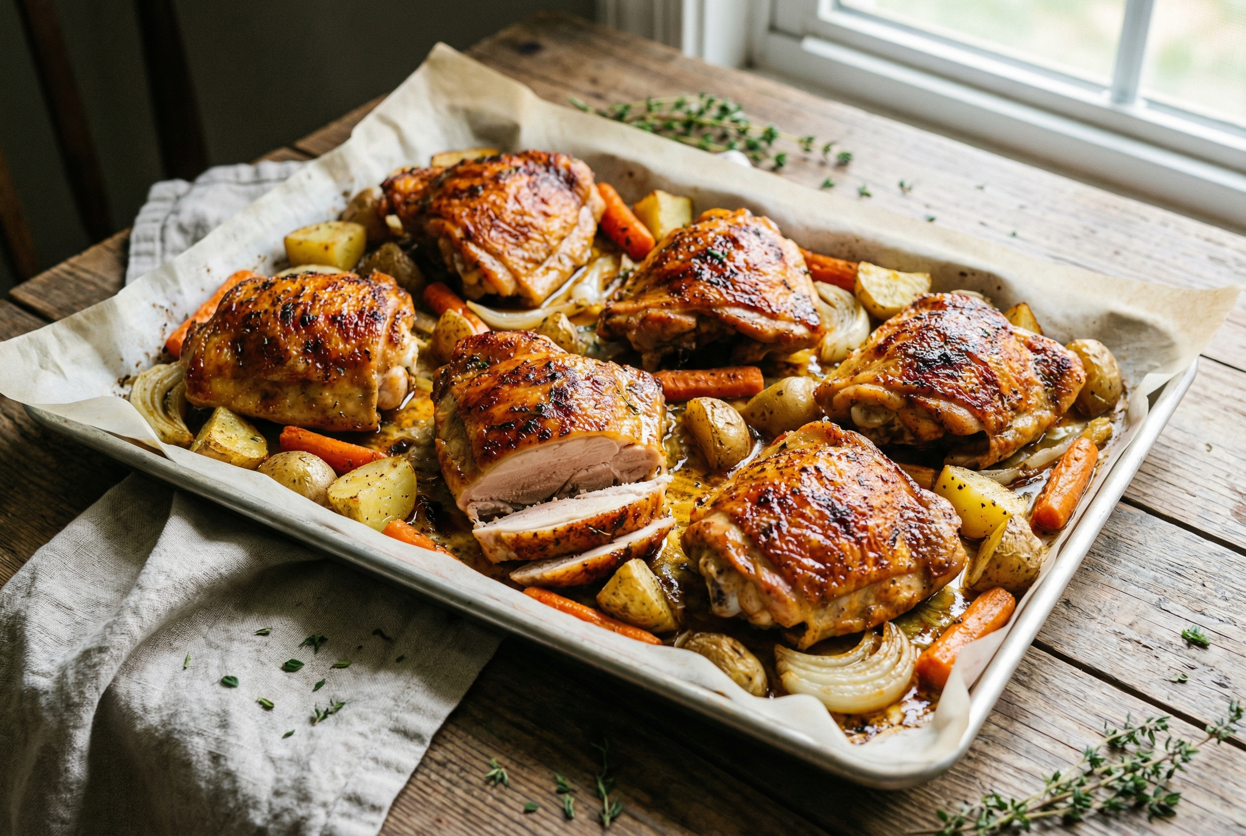 Chicken thighs are one of the best bargains in the meat case, and they’re hard to mess up. This sheet-pan method gives you crackly skin and tender meat without babysitting a skillet. Make a double batch for the freezer so future-you has dinner (and lunches) ready to go.