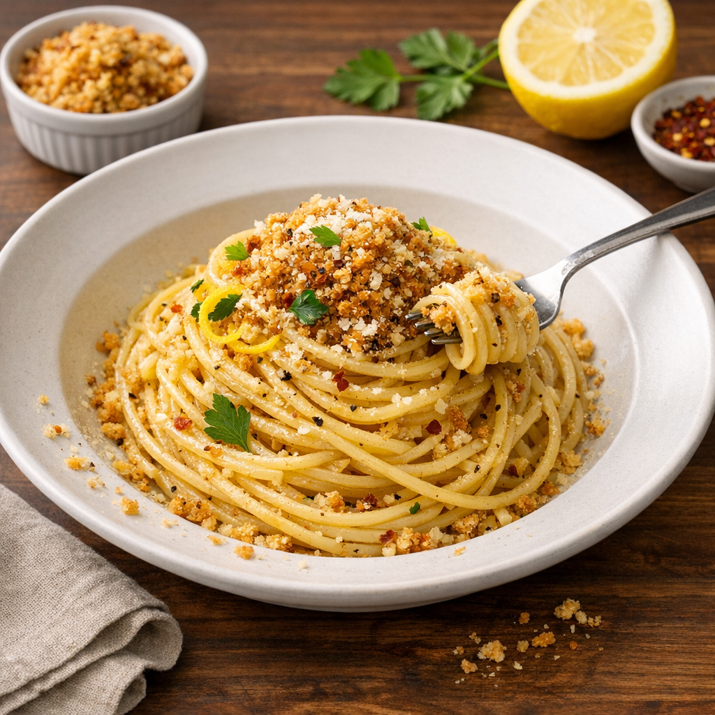 This is the kind of dinner that shows up when the fridge is empty but you still want something satisfying. Everything is made from shelf-stable basics—pasta, breadcrumbs, garlic, and oil—plus optional add-ins if you have them. It’s quick, forgiving, and easy to scale up for leftovers without blowing the grocery budget.