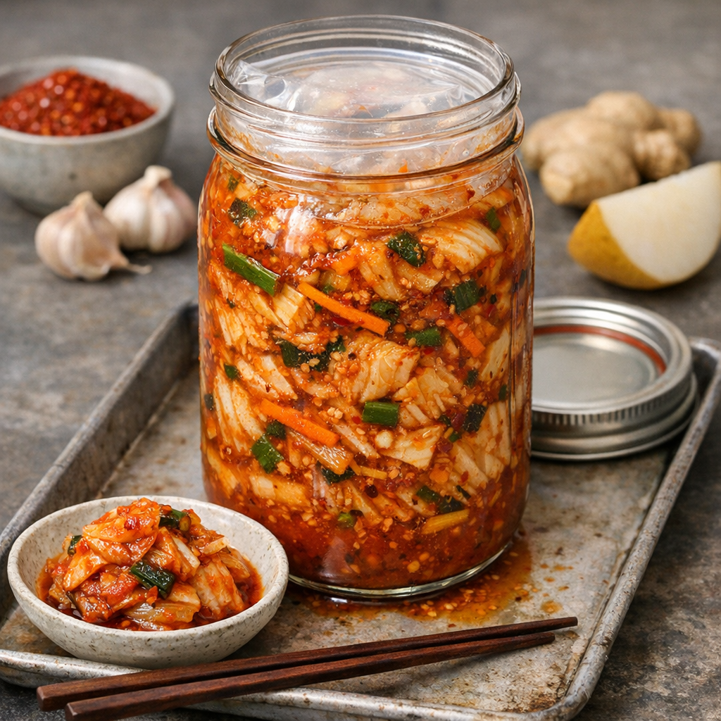 A beginner-friendly napa cabbage kimchi designed for reliable fermentation: crisp texture, bright tang, and a clear process you can measure and repeat. Includes key science notes on salting, osmotic brining, and temperature-driven souring.
