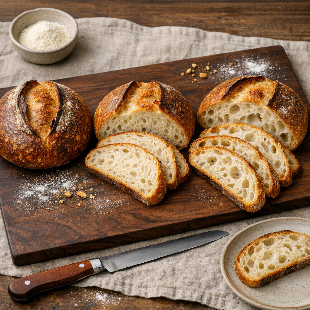 A controlled sourdough bake designed to compare how dough hydration changes gluten development, fermentation speed, handling, and crumb. You’ll mix one base formula and split it into three doughs (65%, 75%, and 85% hydration) for side-by-side observation.