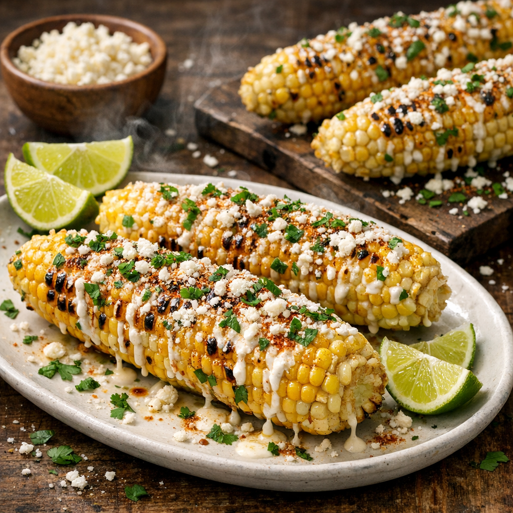 Charred sweet corn slathered with a creamy lime-chile sauce, showered with salty Cotija and cilantro—this classic elote tastes like a bustling Mexican mercado in every bite.