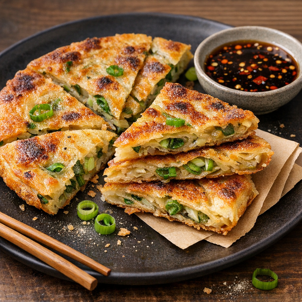 In Taiwan’s night markets, the scallion pancake stall is easy to spot: the hiss of oil, the perfume of toasted flour, and stacks of dough resting under cloth while scallions get chopped at lightning speed. The cook rolls, coils, flattens, and fries each pancake to order, brushing off crumbs with a practiced flick before slicing it into wedges. This version follows the same street-stall method—hot-water dough for tenderness, an oil-flour paste for flaky layers, and a final shallow-fry for that signature crunch.