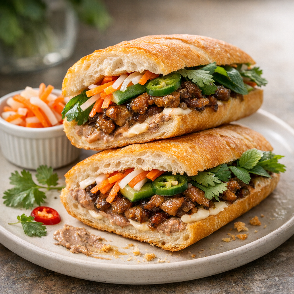 A classic Vietnamese bánh mì built on crisp baguette, savory pork, quick pickles, fresh herbs, and a swipe of pâté and mayo—bright, crunchy, and deeply satisfying like the best corner-stall sandwich.