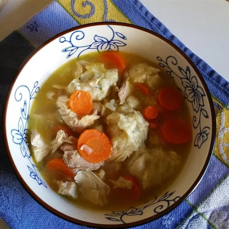 Using a large spoon and knife, scoop a spoonful of dough and cut small pieces into broth. Repeat with remaining dough. Stir, cover, and simmer for about 15 minutes.
