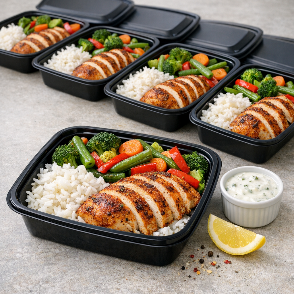 A practical, high-protein chicken-and-rice meal prep built for five grab-and-go lunches. Simple seasoning, big batch cooking, and a veggie mix that reheats well without getting soggy.
