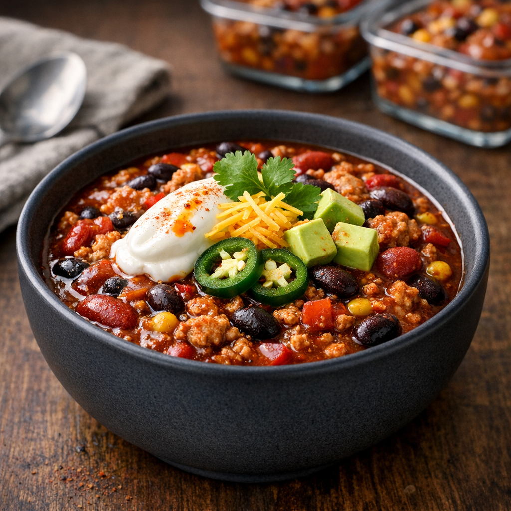 Lean ground turkey chili with beans, veggies, and big flavor—built for meal prep. High-protein, one-pot, and reheats like a champ for quick lunches and dinners.