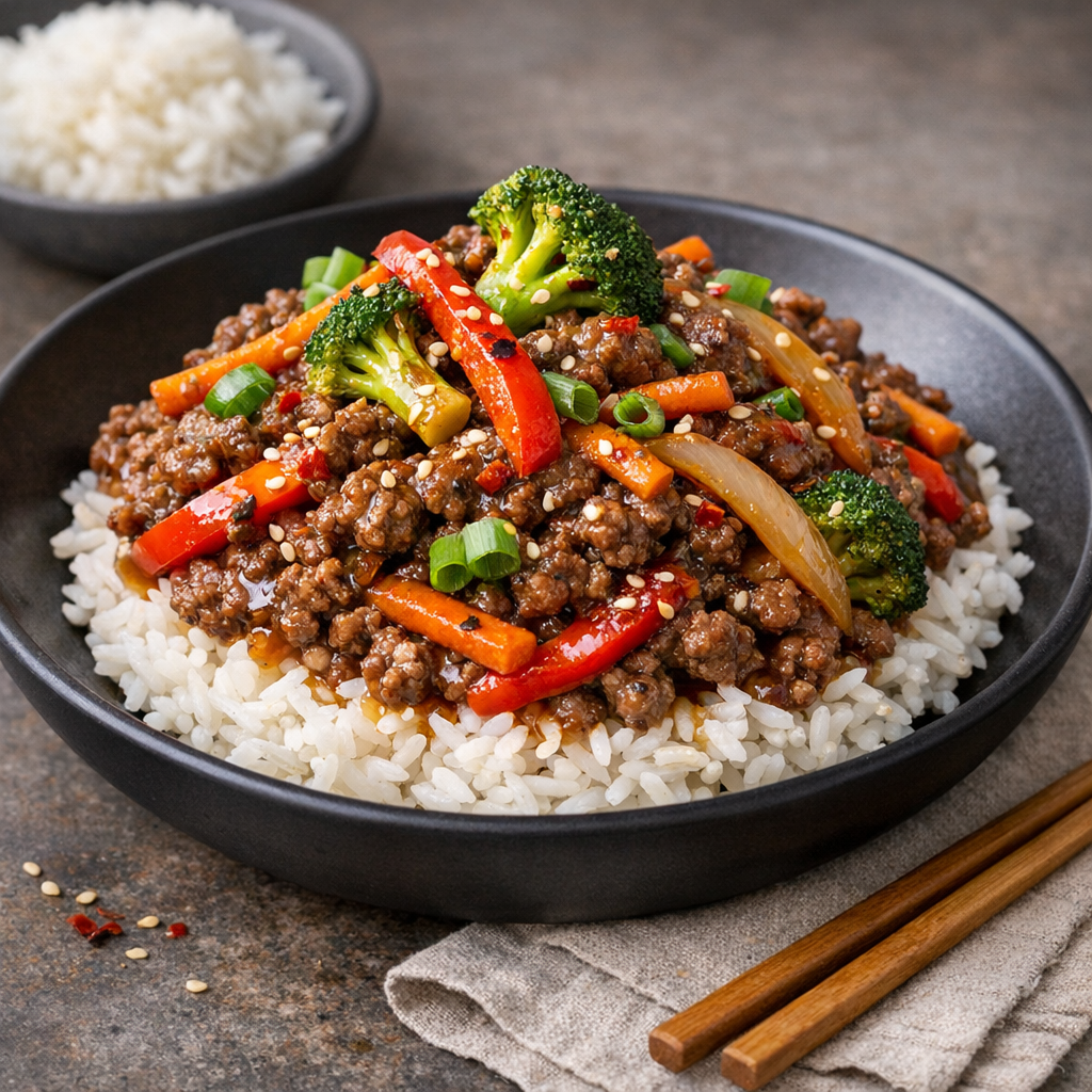 Cook aromatics: Add onion, garlic, and ginger to the beef. Stir 30–60 seconds until fragrant.