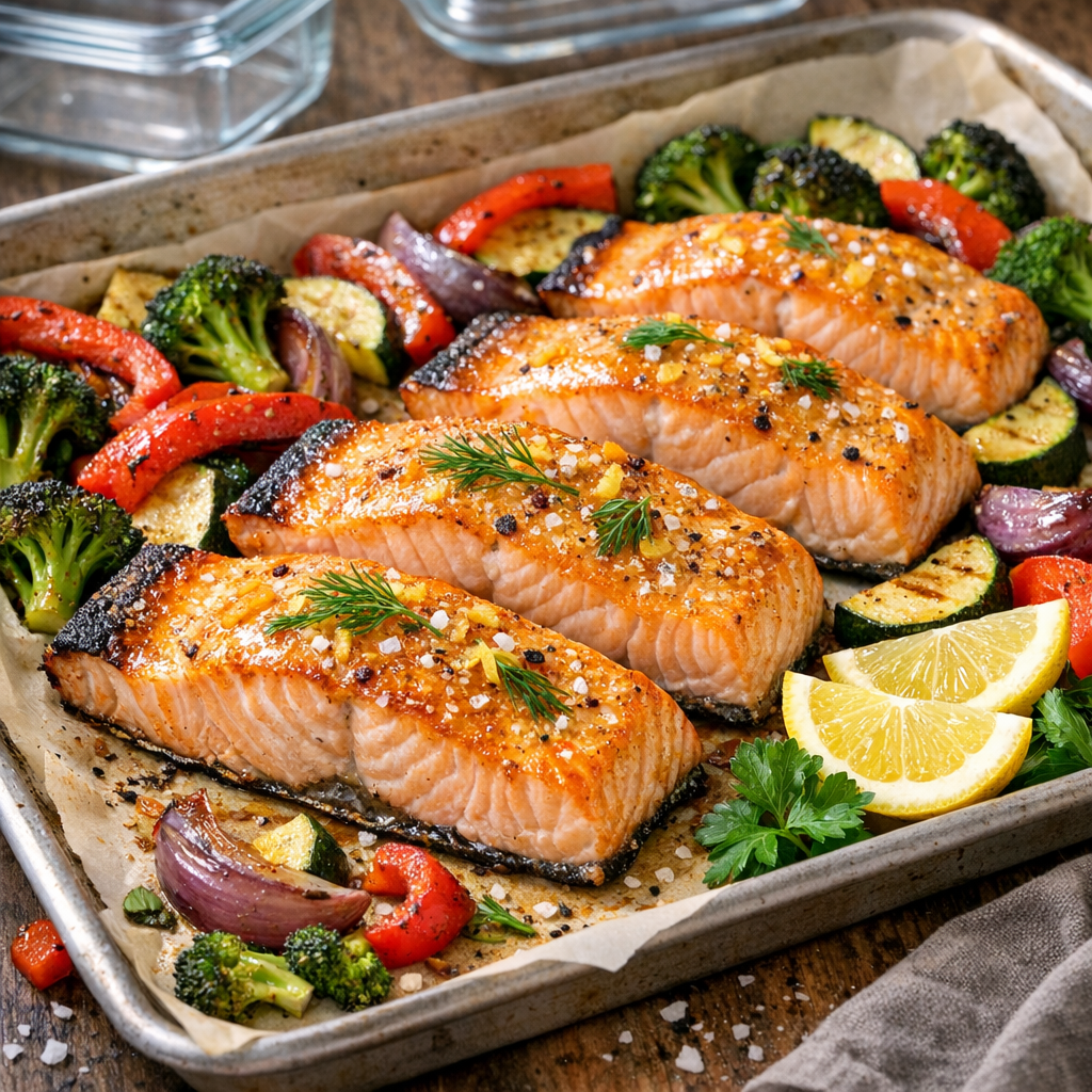 A fast, high-protein sheet-pan meal with salmon and roasted vegetables that holds up well for weekday lunches. Minimal dishes, consistent results, and easy macro control.