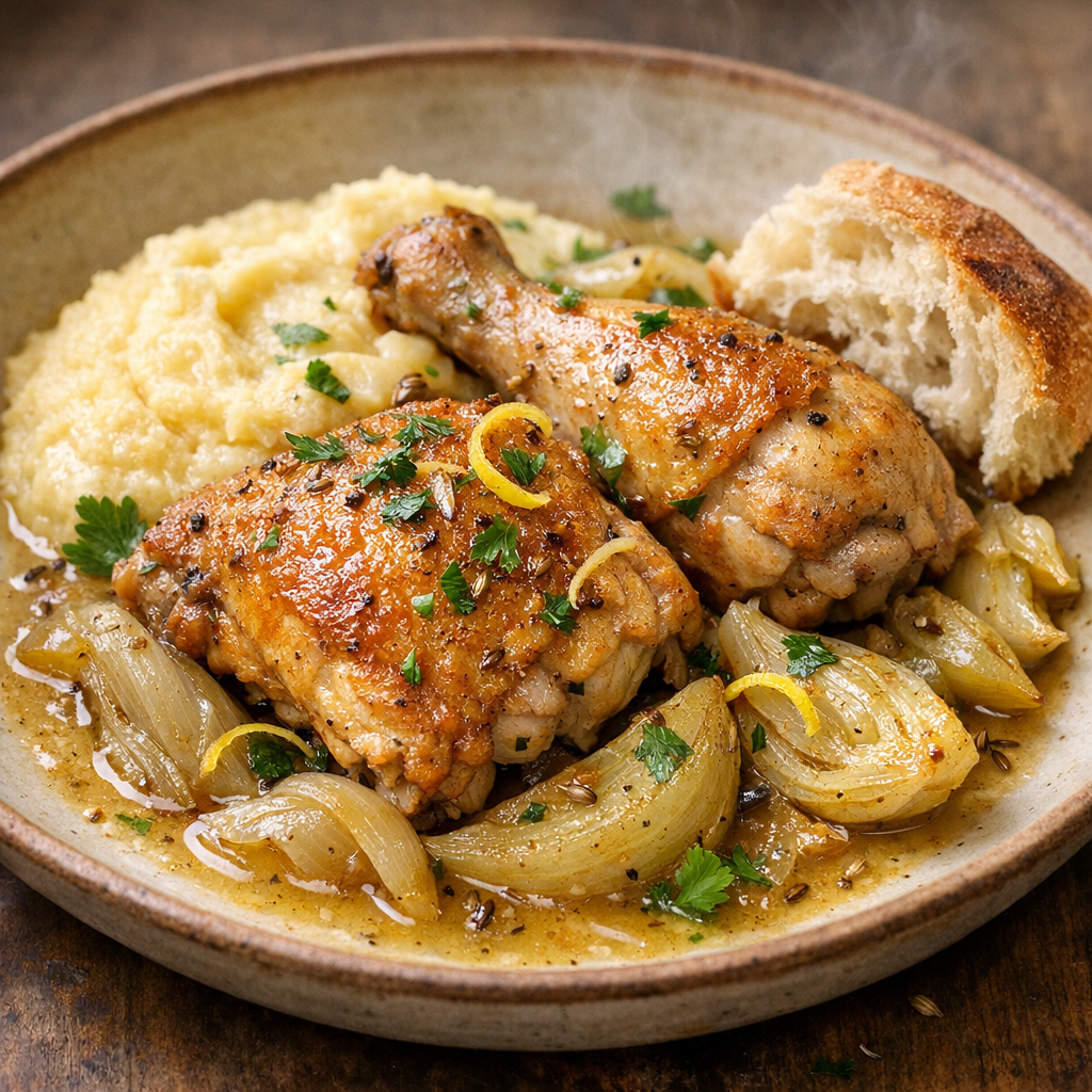 A cozy, traditional Italian braise of golden chicken simmered with sweet fennel, garlic, and a splash of dry white wine until the pan sauce turns silky and fragrant. Serve it with pasta, crusty bread, or creamy polenta to catch every last spoonful.