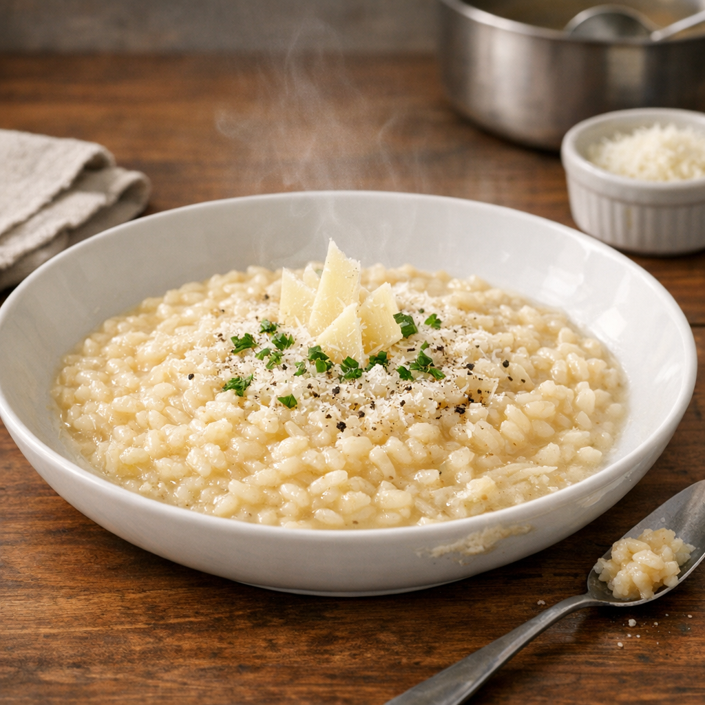 A classic, comforting Italian risotto made the traditional way—slowly stirred, gently simmered, and finished with butter and Parmesan until it turns silky and rich. Simple ingredients, careful attention, and a little patience create a bowl that tastes like home.