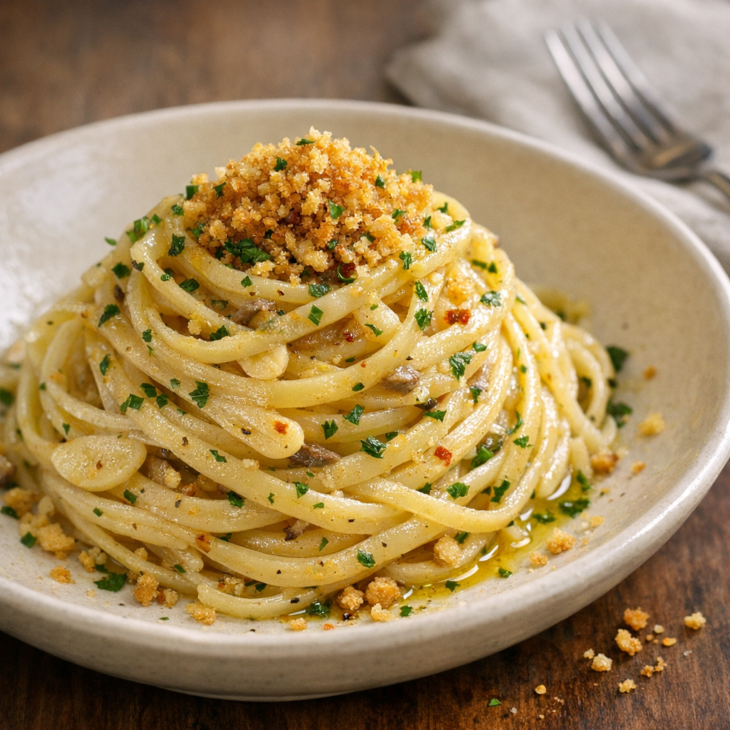 A humble, silky pasta tossed with garlic, olive oil, and anchovies that melt into a savory sauce—finished with parsley and a whisper of chili. Classic Italian comfort food made from pantry staples, ready in minutes.