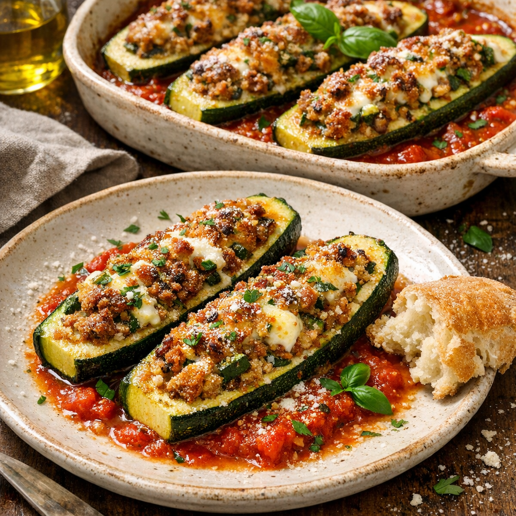 Tender garden zucchini are hollowed, filled with a savory mix of sautéed zucchini flesh, garlic, herbs, breadcrumbs, Parmigiano, and a little sausage, then baked in tomato sauce until bubbling and comforting. A classic Italian home-cooking dish that tastes like late summer at the family table.
