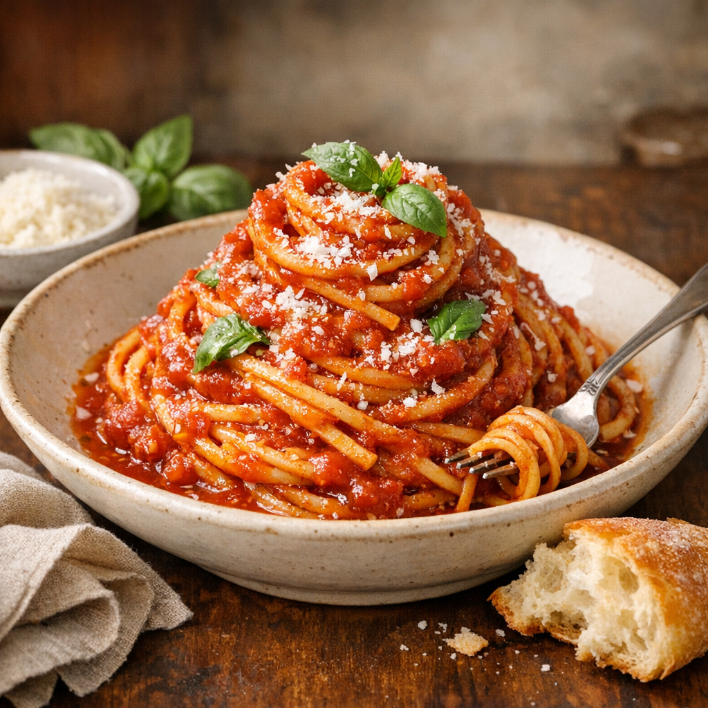 On Sundays, my mother started the sauce before the church bells finished their song, and the whole house warmed with the perfume of garlic and basil. She never hurried it—she let it simmer while stories were told, bread was torn by hand, and someone always “checked” the pot with a spoon. This is that sauce: simple, patient, and made to be shared.