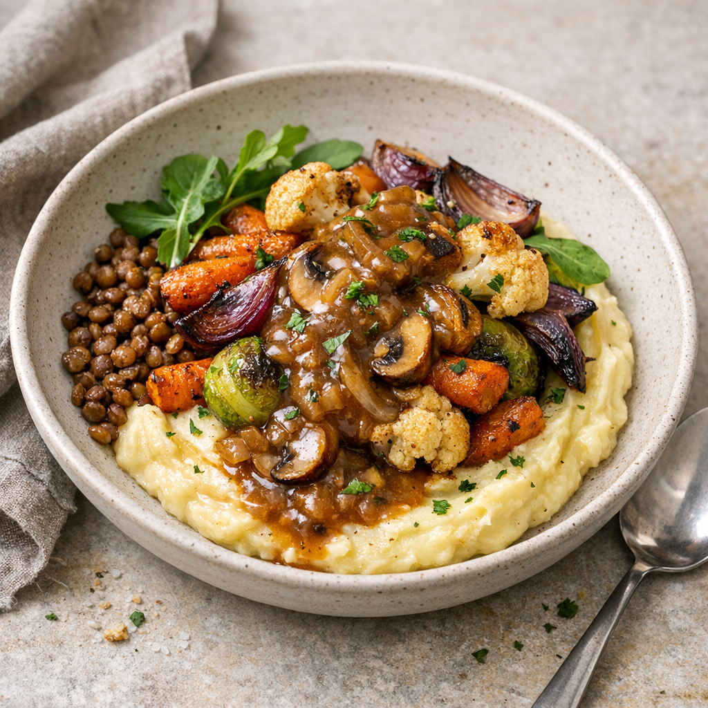 A cozy, plant-powered bowl with roasted vegetables, creamy mashed potatoes, and a savory mushroom-onion gravy. All the comfort-food vibes, with wholesome ingredients and zero compromise.