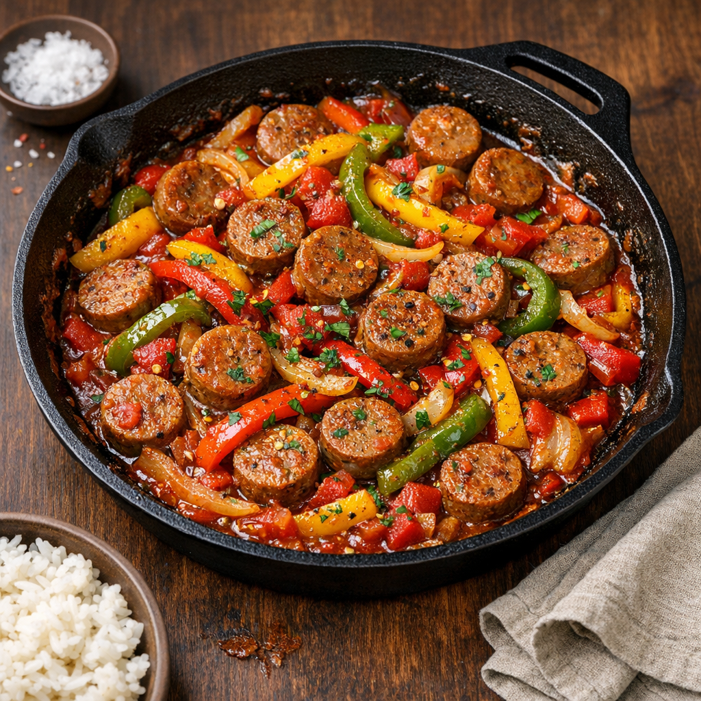 A cozy, weeknight-friendly vegan sausage and peppers skillet with sweet caramelized onions, tender bell peppers, and a glossy tomato-garlic sauce—comfort food that still feels fresh and nourishing.