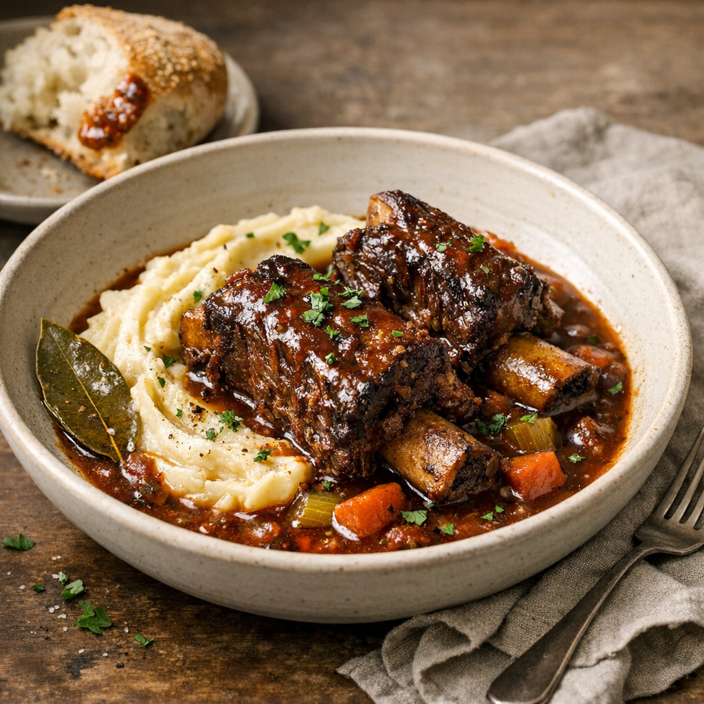Tender, fall-apart beef short ribs slowly braised in red wine, tomatoes, and aromatics until the kitchen smells like comfort. A steady, unhurried roast-style meal meant for lingering at the table and dipping bread into the sauce.