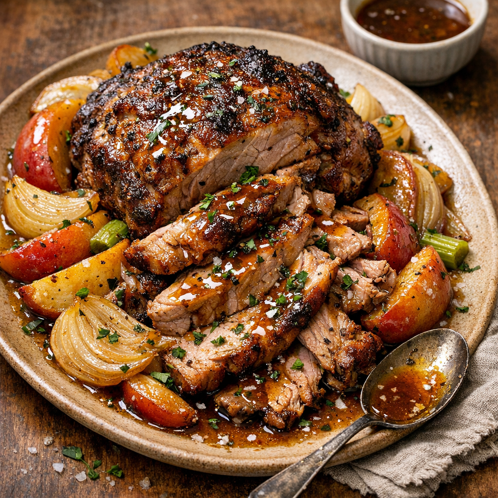 A slow, herb-scented pork shoulder roasted until spoon-tender, nestled with apples and onions that turn jammy in the pan juices. This is the kind of unhurried Sunday meal that perfumes the kitchen and rewards patience with deep, cozy flavor.